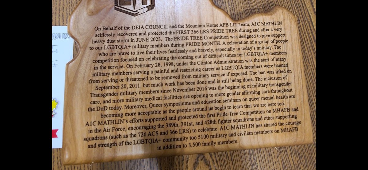 “On Behalf of the DEIA COUNCIL and the @MountainHomeAFB LIT Team, AIC MATHLIN selflessly recovered and protected the FIRST 366 LRS PRIDE TREE during and after a very heavy dust storm in JUNE 2023. The PRIDE TREE Competition was designed to give support to our LGBTQIA+ military members during PRIDE MONTH. A celebration of a group of people who are brave to live their lives fearlessly and bravely, especially in today's military. The competition focused on celebrating the coming out of difficult times for LGBTQIA+ members in the service…”
