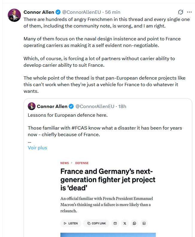 Et nous ne sommes pas irréprochables, nous avons trop souvent envie de transformer nos avantages comparatifs en un "droit à la prééminence politique" que rien ne légitime. Dans cette affaire SCAF-NGF il faut rester sur l'industrie et les besoins ops et ne pas se laisser aller. 2/