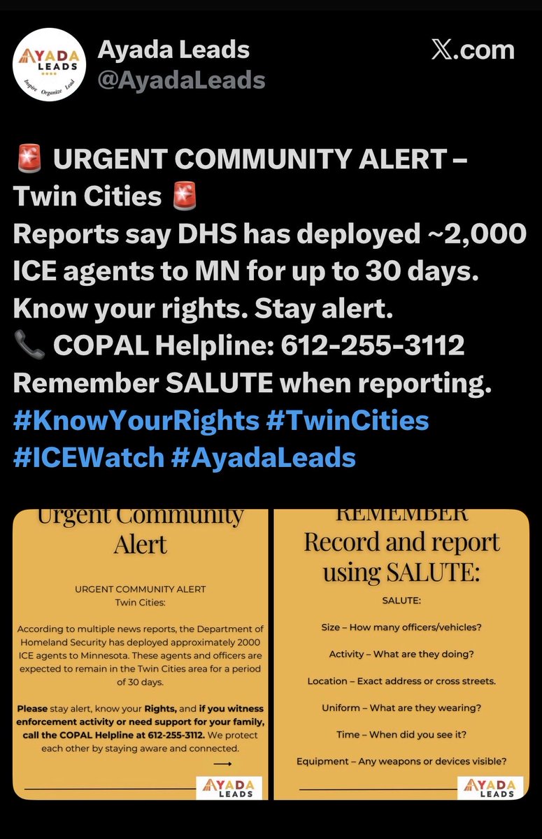 AyadaLeads are one of the groups going after ICE in MN. (See post) Latino COPAL runs a helpline to report ICE. And utilizes SALUTE reporting guidelines.