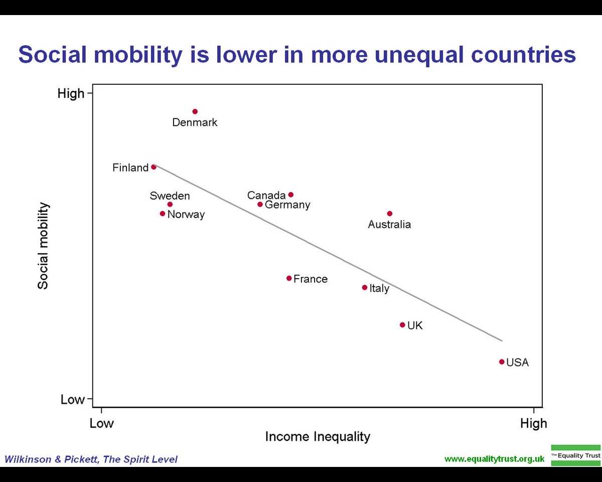 Ja men folk kan ju röra sig uppåt i inkomst! Det är väl bara att göra det lättare, då är man ju inte vara fattig så länge! Well, om ett land är ojämlikt sjunker social rörlighet, så i ett ojämlikt land är sannolikheten högre att du alltid kommer vara i samma klass du föddes in i.