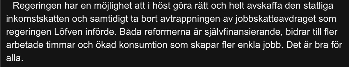 Här är artikeln. TL;DR:en är att Kopsch ser ett linjärt samband mellan ojämlikhet och välstånd - ju mer ojämlikt, desto mer välstånd alltså. Sen kommer det tre reformer som skall generera riktigt rejäla inkomstklyftor. Vilket alltså tydligen är bra grejer. expressen.se/debatt/sverige…