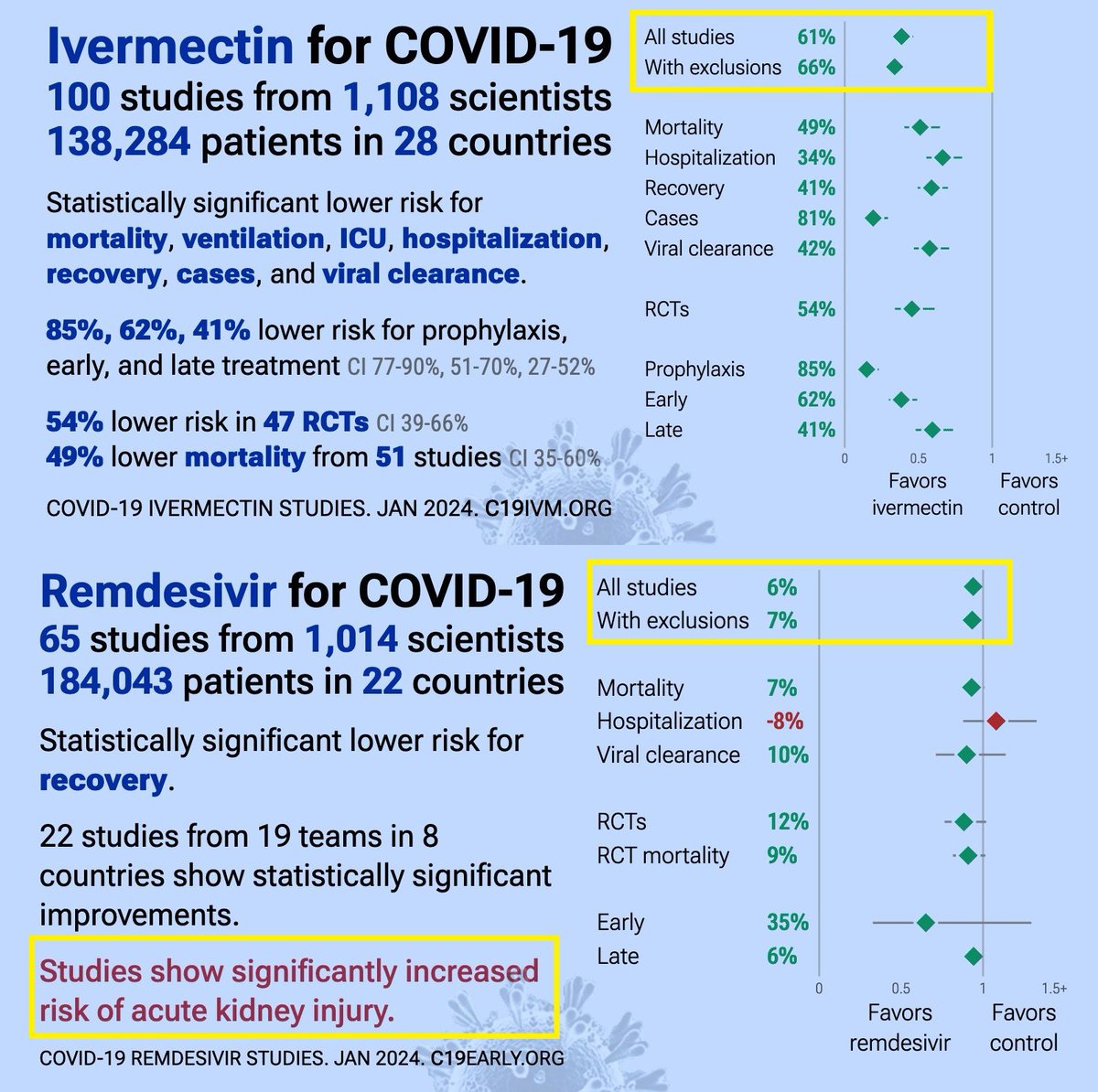 A pamiętacie może jak mieliśmy ponoć najstraszliwszą pandemię w dziejach i jak lekarze zgodnie ze swoją wcześniejszą wiedzą i literaturą naukową zaczęli stosować na "COVID-19" tanie, dobrze przebadane, skuteczne leki i osiągali świetne wyniki, to każde wspomnienie tych leków przez nich, kończyło się cenzurą, dyscyplinarkami, banowaniem, kiedy jednocześnie polecano drogie, nieskuteczne i toksyczne leki jak remdesivir, leki mutagenne typu molnupiravir, nadużywanie respiratorów lub oficjalne wytyczne, aby ograniczać podaż antybiotyków na post-wiralne zapalenia płuc nazwane COVID-19 przez korelację z wynikiem testu PCR+?