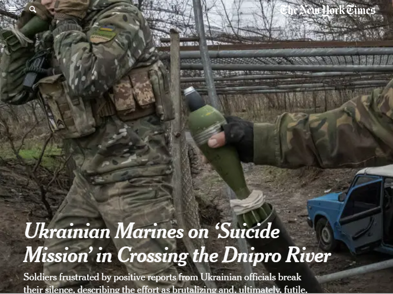 It looks like @nytimes & other Western media reverse narrative concerning #UkraineWar : "Ukrainian Marines on ‘Suicide Mission’ in Crossing the Dnipro River. Soldiers frustrated by positive reports from Ukrainian officials break their silence, describing the effort as brutalizing and, ultimately, futile." nytimes.com/2023/12/16/wor…