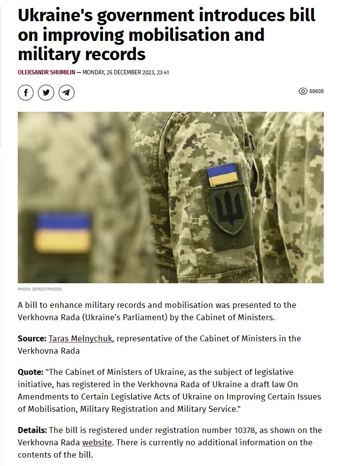 "Ukraine's government introduces bill on improving mobilisation and military records." Text of this bill is absent on site of parliament, & the bill webpage is down because of heavy traffic even though it is middle of the night in Ukraine. pravda.com.ua/eng/news/2023/…