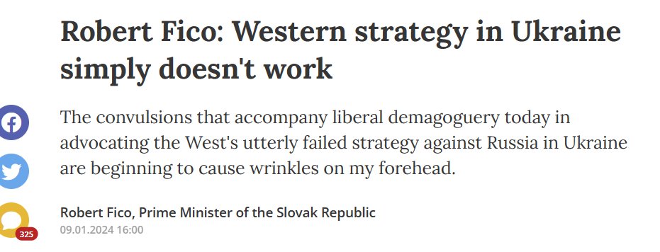 "Robert Fico: Western strategy in Ukraine simply doesn't work. The convulsions that accompany liberal demagoguery today in advocating the West's utterly failed strategy against Russia in Ukraine are beginning to cause wrinkles on my forehead.