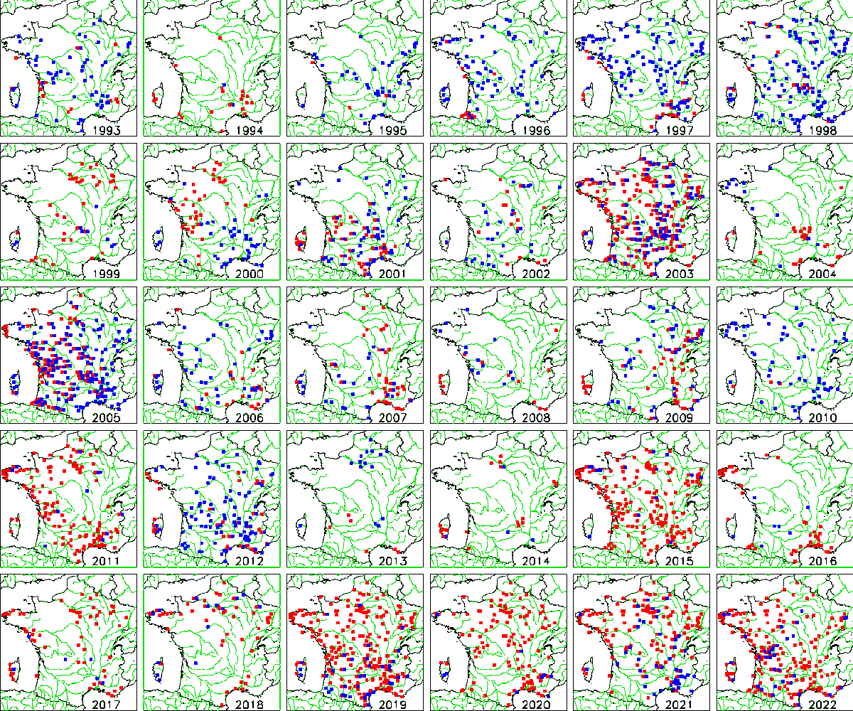 Entre autres informations, on a la date (année et jour) des records mensuels (chaud et froid). La carte ci-attachée montre les années où les stations ont connu au moins un record mensuel de chaud (rouge) ou froid (bleu).