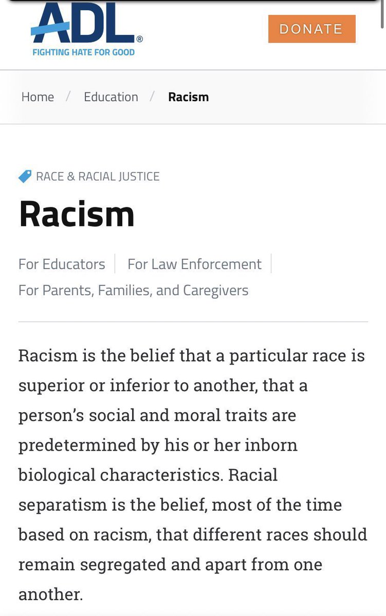 Apparently the ADL has cycled through three definitions of "racism" on its website recently, and the current definition is listed as an "interim definition." This is seriously like a Monty Python sketch.