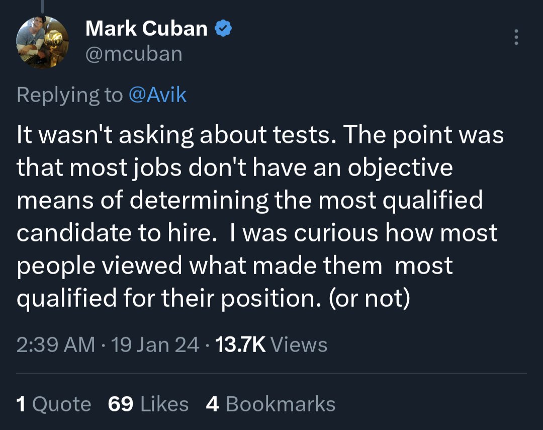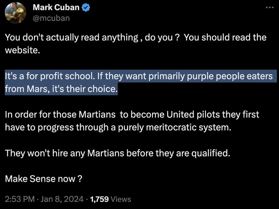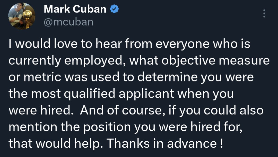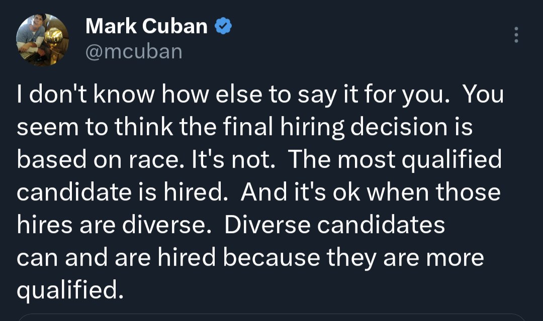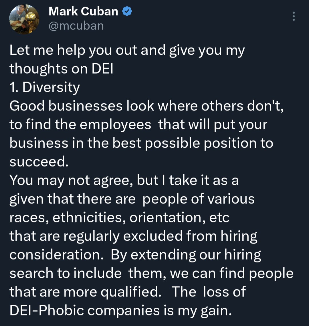 The thing that bothers me most in this still-ongoing Mark Cuban/DEI saga is that rather than picking a particular principle or premise to defend (even a bad one), he just keeps moving the goalposts. I've seen him argue all of the following four points (see next tweet):