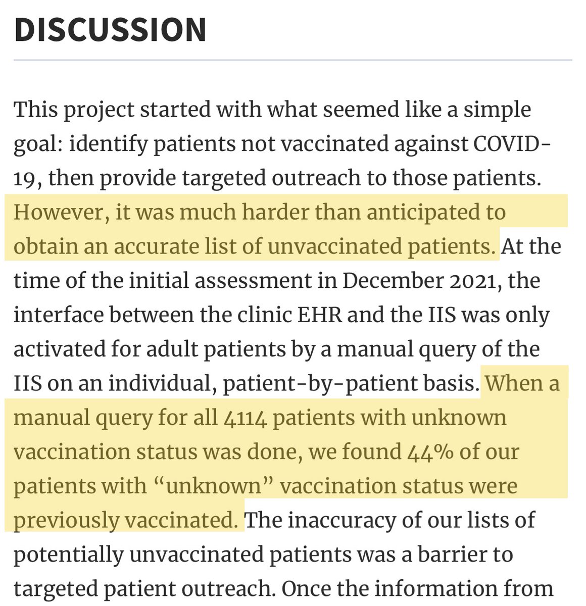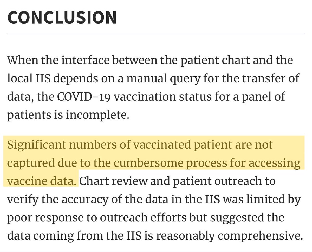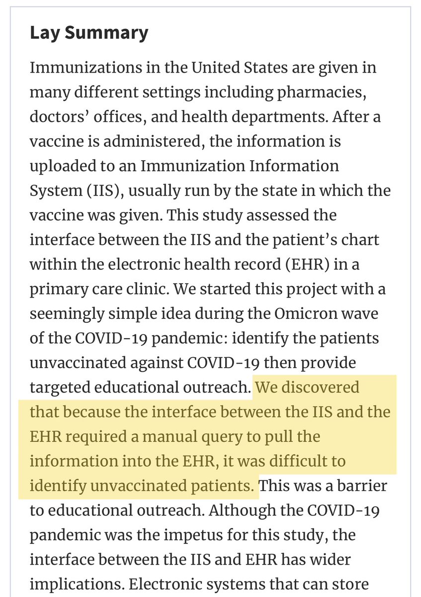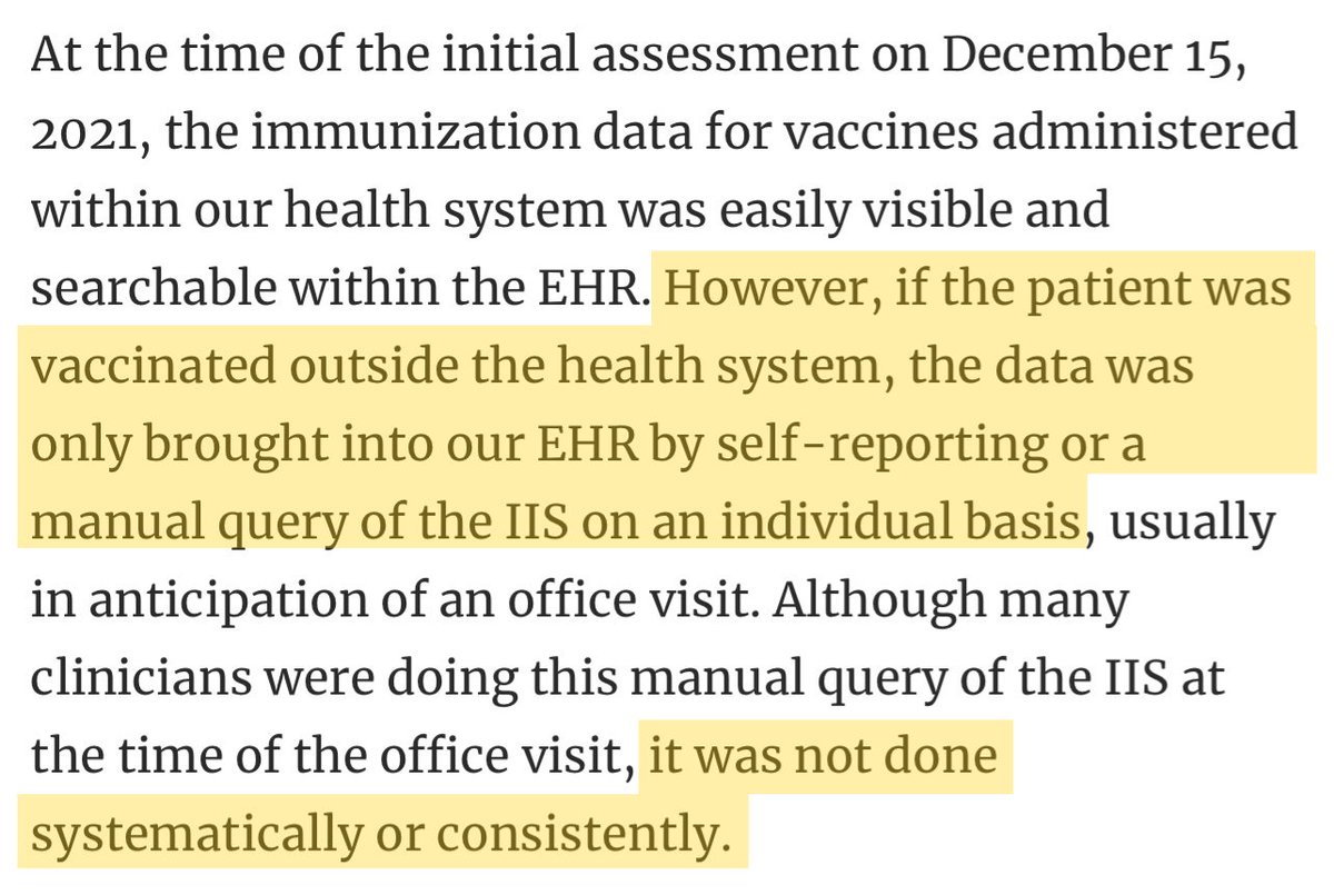 4. In April 2023, a peer-reviewed study was published which looked at this very concern to determine how it impacted the accuracy of reported vaccination statuses. Interestingly the study “discovered that because the interface between the IIS and the EHR required a manual query to pull the information into the EHR, it was difficult to identify unvaccinated patients.” How could that be? Read on…