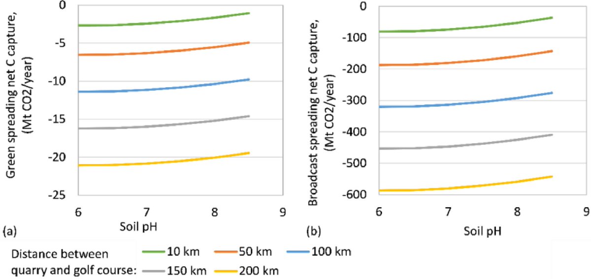 1๏ธโฃ โWhen environment favors, a 18-hole golf course in regions with an average temp >25ยฐC & soil pH around 8.5, the net CO2 sequestration potential achieved by substituting quartz sand with basaltic sand on putting greens was a minimum 0.42 Mt CO2(eq) yrโ1.โ