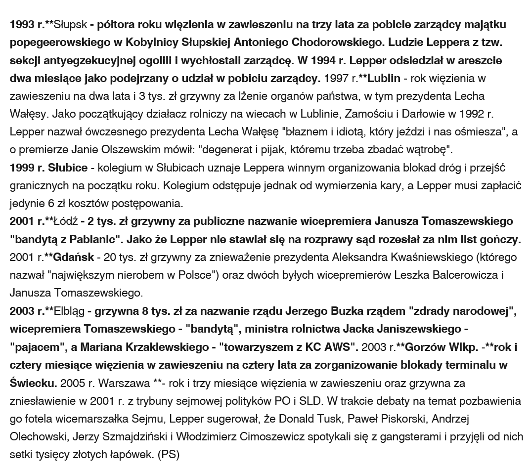...co przejściowo obudziło współczucie dla najbardziej medialnej z nich, dopóki nie skazano jej za oszustwa. Inny fałszował dokumenty i ukrywał majątek przed wierzycielami; prominentna posłanka ukradła kombajn, i tak dalej. Szefował zaś tej patogali Andrzej Lepper.