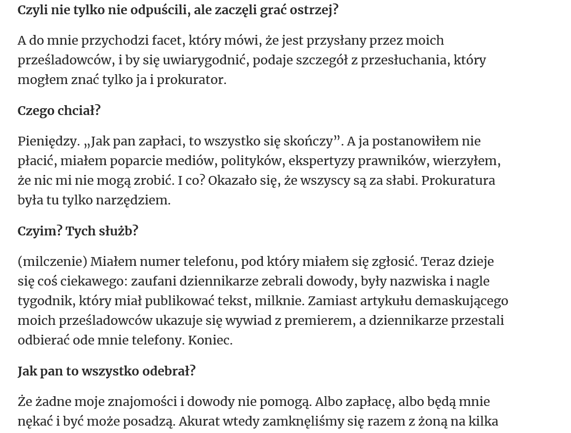Panowie Ryba i Kryszyński chodzili po Warszawie i opowiadali, że odkąd Lepper został ministrem, to mogą załatwić dowolne odrolnienie, tylko trzeba im dać pół miliona, bo minister dużo bierze. Były powody do inwigilacji i sąd dał na nią zgodę, mimo braku przepisów wykonawczych.