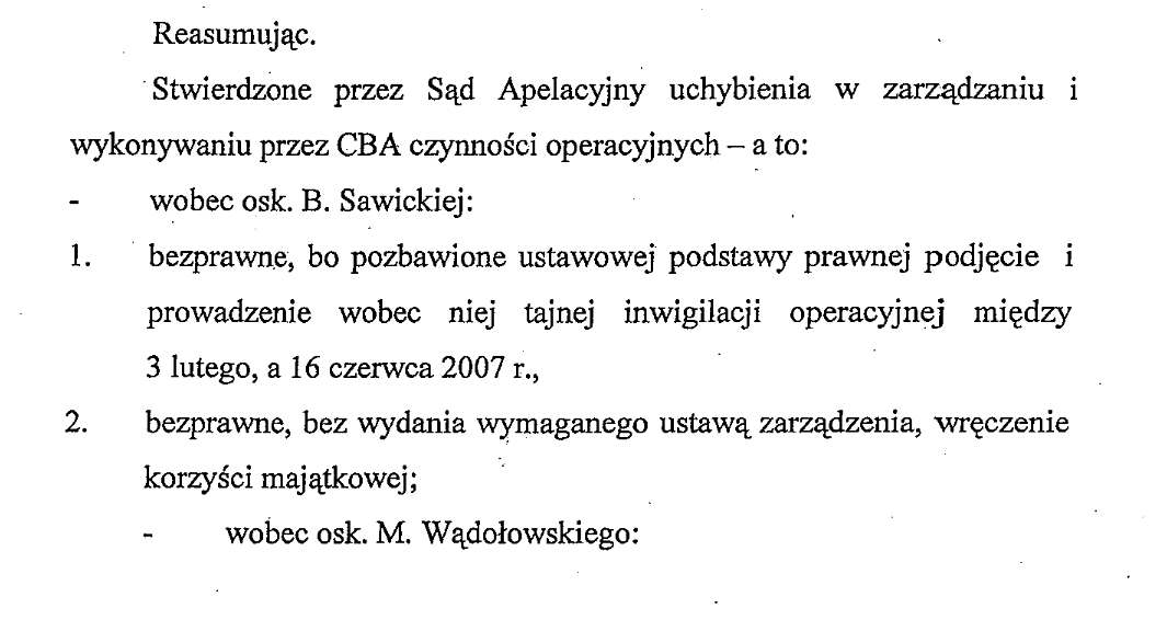 Po pierwsze - uznał że CBA nie miało prawa w ogóle "produkować" dokumentów legalizacyjnych dla całej operacji bez przepisów wykonawczych. A zatem - fałszowało je. Po drugie - uznał, że okłamywało sądy, które udzielały zgody na poszcz. czynności operacyjne, manipulując stanem fakt