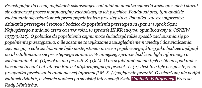 Na poparcie tej tezy przedstawił w uzasadnieniu tylko jeden argument: CBA dysponowało informacją o jeszcze drugim przestępstwie, już popełnionym przez Kryszyńskiego, a więc mocniejszym dowodowo i łatwiejszym do wykrycia. Nie podjęło jednak działań w tej sprawie...