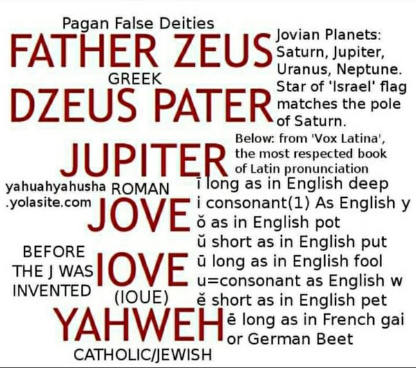 In Latin, Jupiter is Jove. Latin has no J. The pronunciation of J is Y. The short “o” is the “aw” sound in “off.” In Latin, the V is pronounced W, making the Latin pronunciation of Jove as Yahweh.