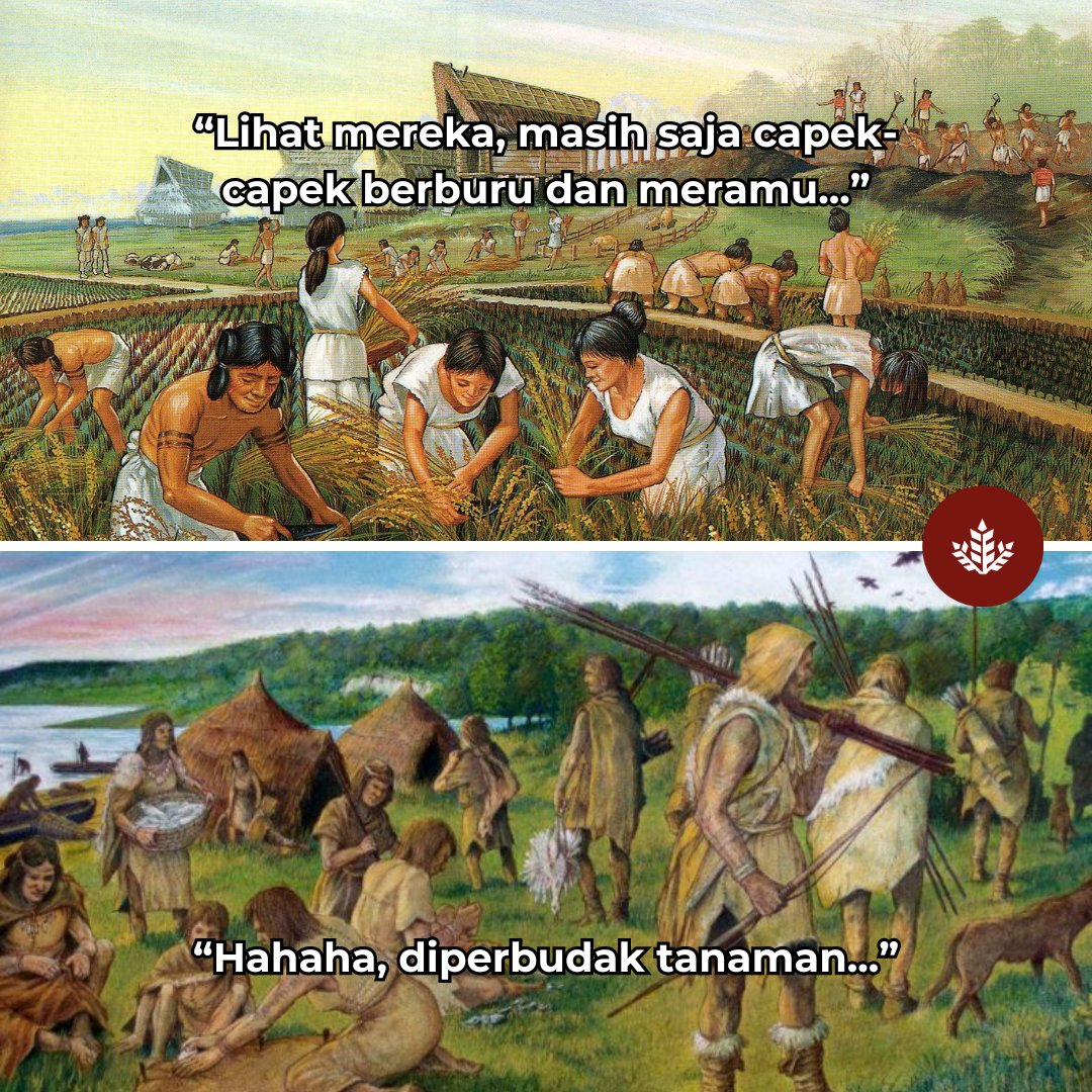 Masyarakat pemburu-pengumpul harus bekerja keras untuk mencari makan setiap hari dan sering kali berada di ambang kelaparan. Mereka hidup tanpa menikmati kenyamanan bendawi yang mendasar sekalipun, seperti tempat tidur yang empuk dan sandang yang memadai, lalu akhirnya mati muda.