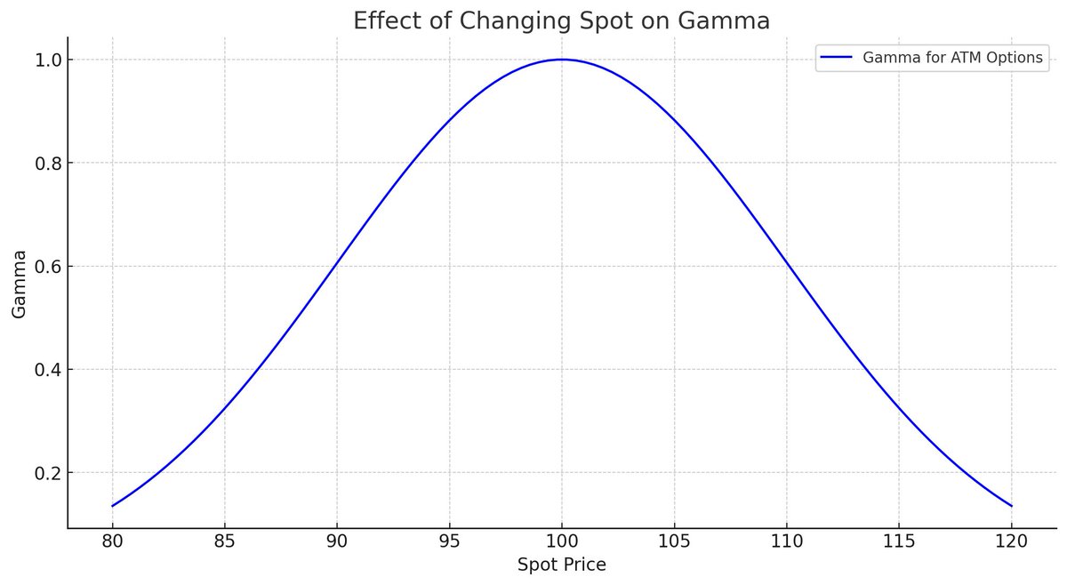 3/ ATM Options and Gamma. ATM options, hovering around a 50% delta, react significantly to even slight changes in the spot price. This heightened sensitivity results in higher gamma. Another simple chart here