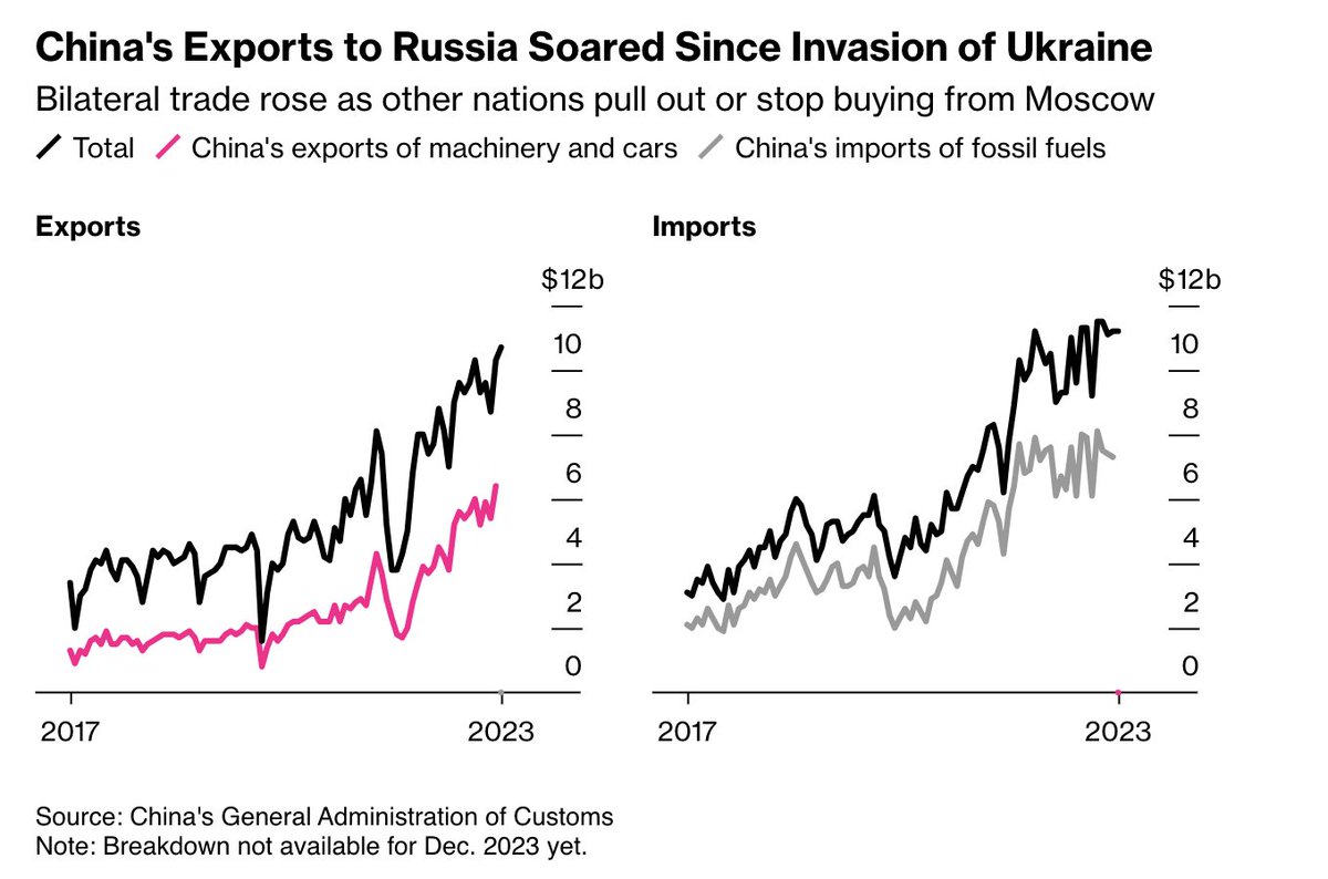- Reorienting and pivoting to China is crucial for Russia’s wartime economy. Last year, the trade between the two countries exponentially grew, hitting unprecedented levels. Russia receives almost 80% of its components, especially electronics from or through China. 14/18