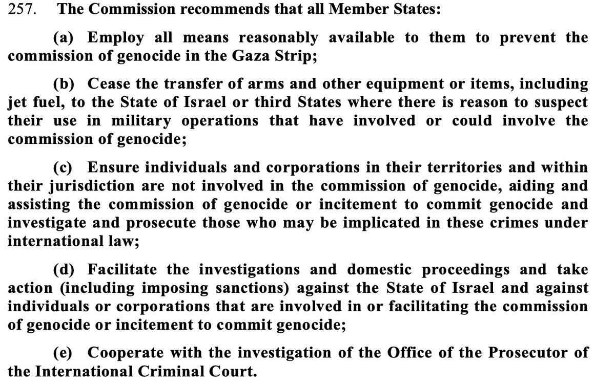 The Commission recommends that all Member States: Employ all means reasonably available to them to prevent the commission of genocide in the Gaza Strip;