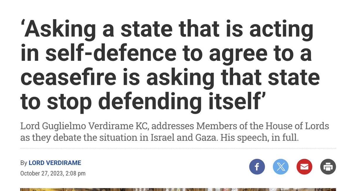 3. Verdirame's partisan views are clear in this October 2023 speech in the Lords which adopted and defended a pro-Israeli view of "proportionality" in "self-defence" - the highly permissive nature of this view has legitimated the genocidal destruction we've witnessed.