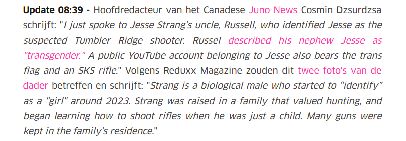 Op een Canadese school is een bloedbad aangericht. Hoewel de dader — die zelf dood is — een jurk droeg, werd al snel duidelijk dat het een 18-jarige man betrof: Jesse Strang. De @NOS wil ons echter nog steeds laten geloven dat de dader een vrouw was. 1/9 #desinformatie #nepnieuws