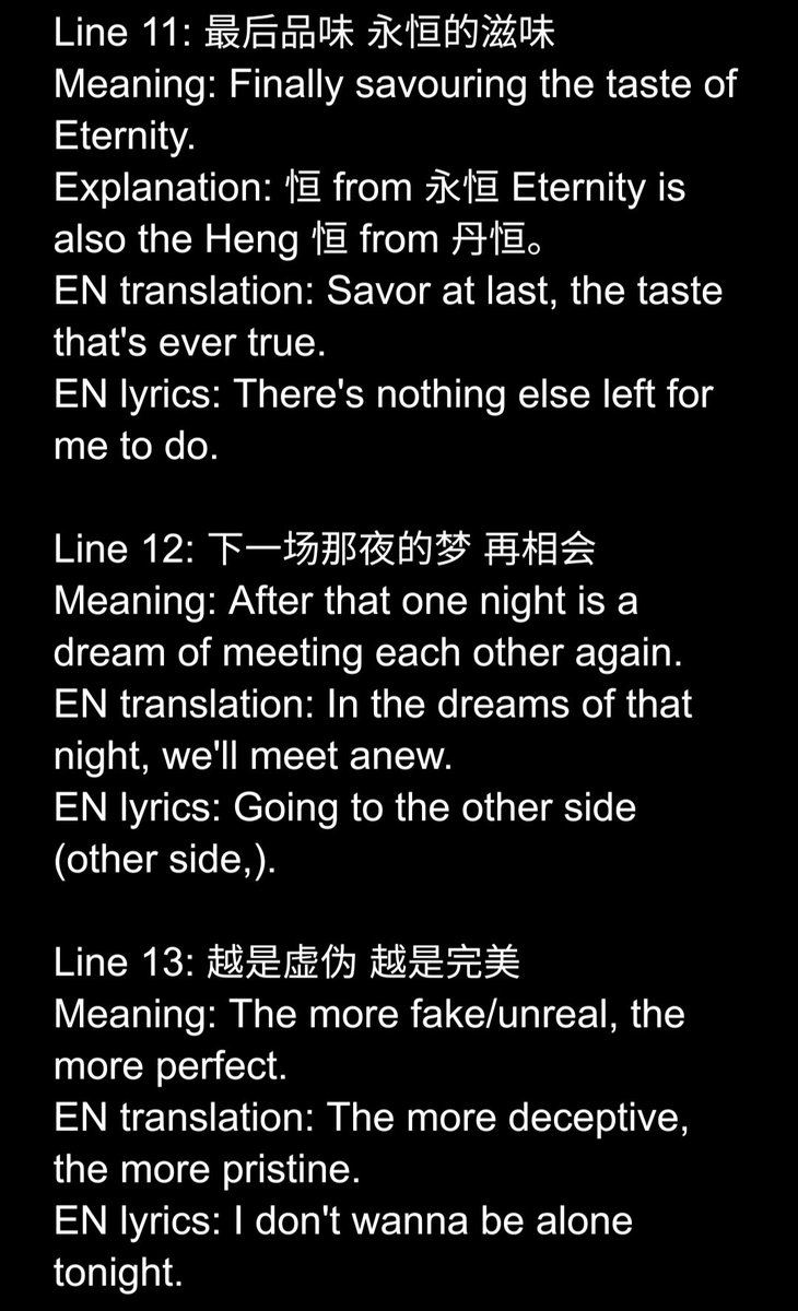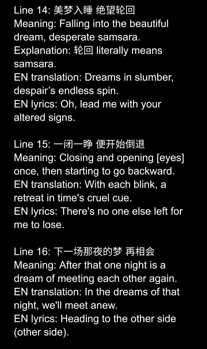 The official EN translation of the CN lyrics loses a bit of nuances (and uses some hard-to-understand grammar structures to make it rhyme), so I did my own translation, with comparison to official EN translation and EN lyrics.