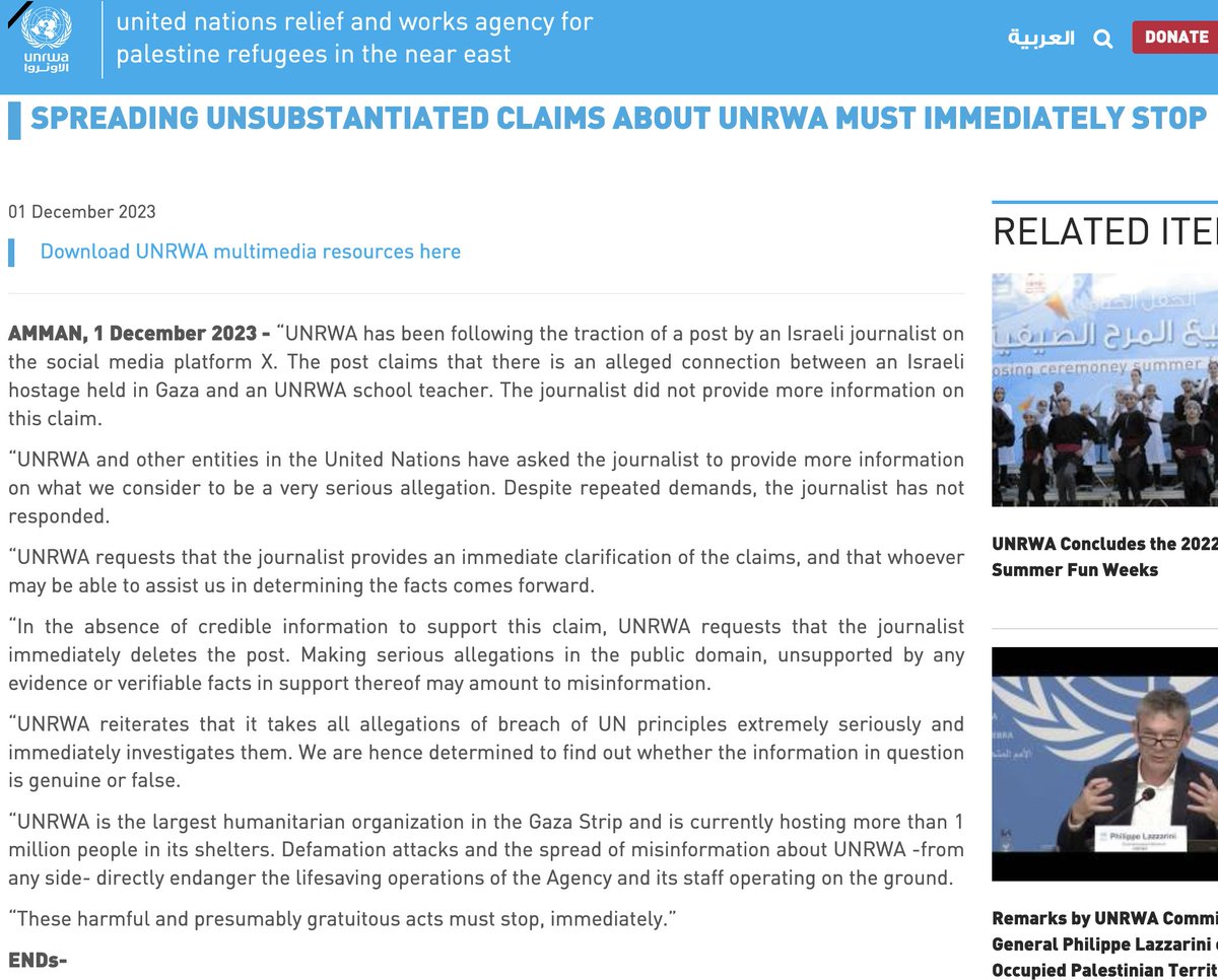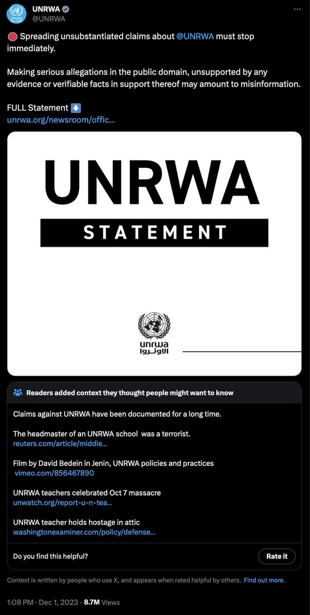 Spreading unsubstantiated claims about @UNRWA must stop immediately.