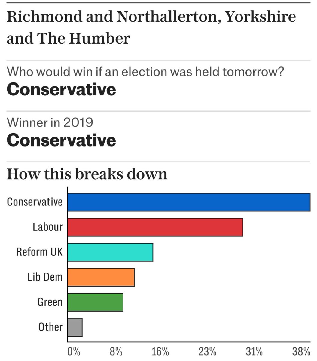2/ Trouble with MRP is it models local demographics but local conditions... here's an example: Sunak's own seat of Richmond & Northallerton... is anyone seriously telling me that if it was in play for Labour 9% would vote Green?