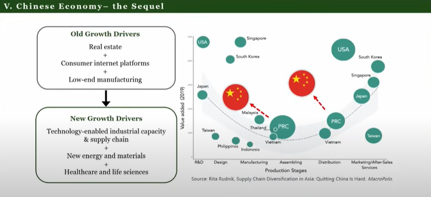 As a result China needs to find new pillars. So far it had stayed at the bottom of the "smile curve", focusing on manufacturing/assembling/distribution, growing in size there, but to keep developing it needs to move upper left: more R&D & design, and capturing more value add.