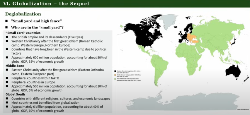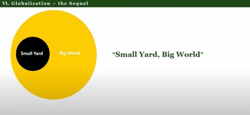 He concludes by looking at the future of globalization. He differentiate between "small yard countries" ("the British empire and its 4 grandsons", Western Europe and Japan), that is currently trying to protect itself with a "high fence", and the global South.