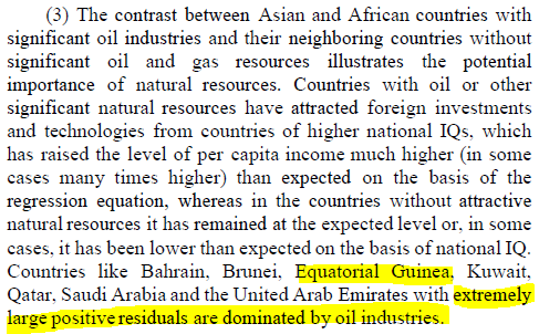 In addition to getting the national estimate wrong, Swann also acts like Lynn was unaware of Equatorial Guinea's large positive GDP residual. Actually, Lynn devoted entire chapters to these residuals