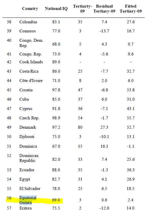 People so often misrepresent Lynn's data that I thought it would be worth checking the actual source for Swann's claim. Let's check Lynn's latest (2012) compilation of estimates. Oh, look, Equatorial Guinea estimated at 69, not 59 🙄