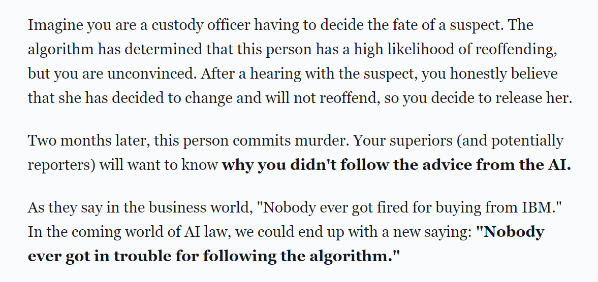 Even if humans are formally in control 'for compliance reasons', the actual decision-making power could ultimately reside with AI, as 'Nobody ever got into trouble for following the algorithm'.