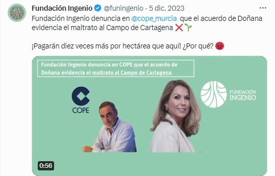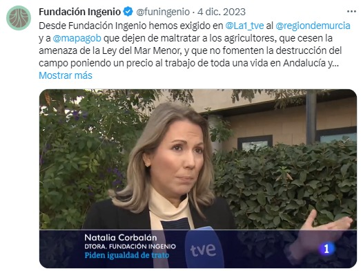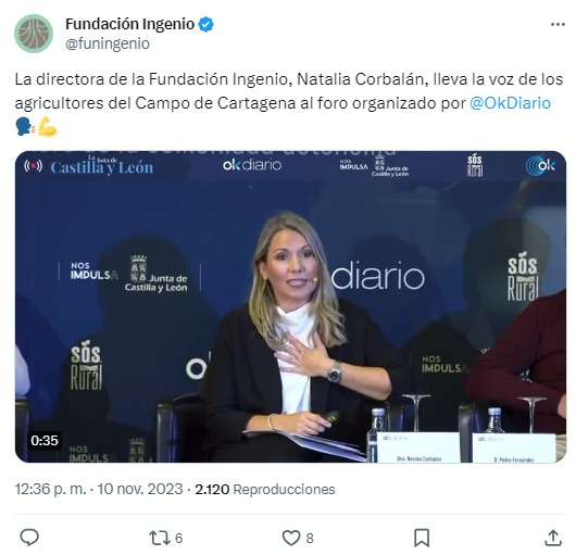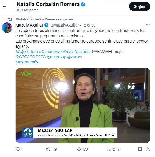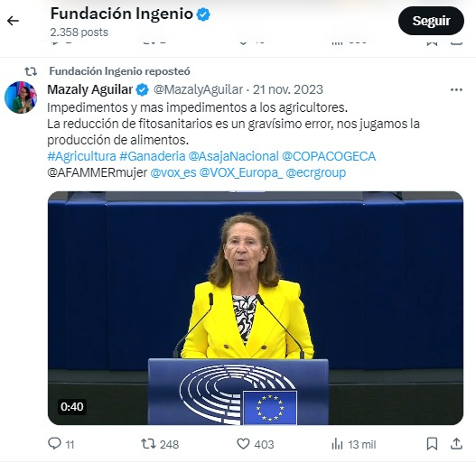 Tanto la fundación Ingenio como su CEO y portavoz actual de SOS Rural retuitea a su principal aliada política en Europa, la eurodiputada de VOX Mazaly Aguilar, como ya lo hiciera Victor Viciedo.