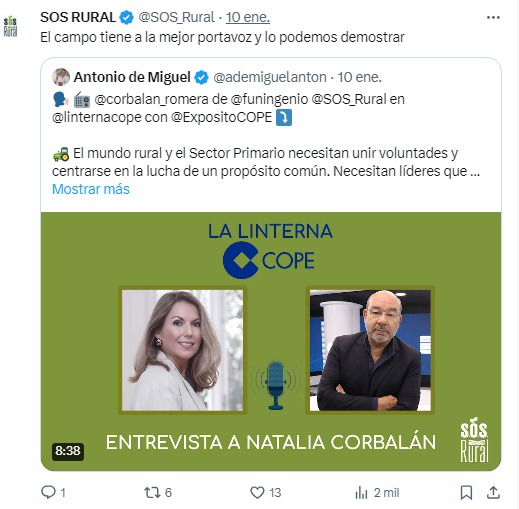 Por si quedaba alguna duda del objetivo electoralista de esta plataforma SOS Rural y la fundación Ingenio, la CEO y portavoz ha presentado recientemente SOS Rural Galicia, justo donde hay elecciones, nadie se acercó a su carpa, pero varios medios le dieron cobertura.