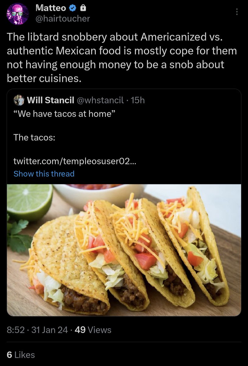 Rationalizing downward mobility. Venerating the taco truck. The college grad white urbanoids of the 1990s, the Frasier Cranes and Rachel Greens of the world, would have joked about it looking like vomit then headed to their favorite French bistro, the one with the chef from Lyon.