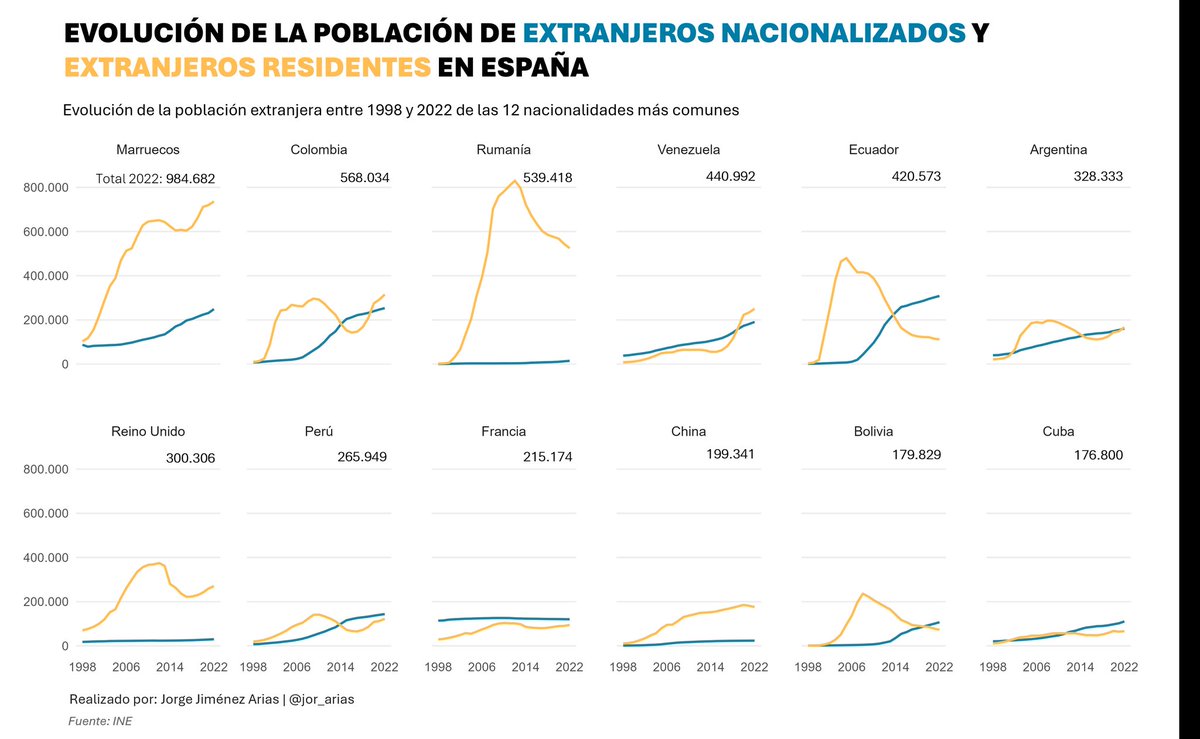 Si analizamos la evolución de las 12 nacionalidades más comunes en España, se aprecia una tendencia donde los residentes extranjeros transicionan a nacionalizados. Este efecto se aprecia de forma notable entre los marroquíes, colombianos, venezolanos, ecuatorianos y argentinos.