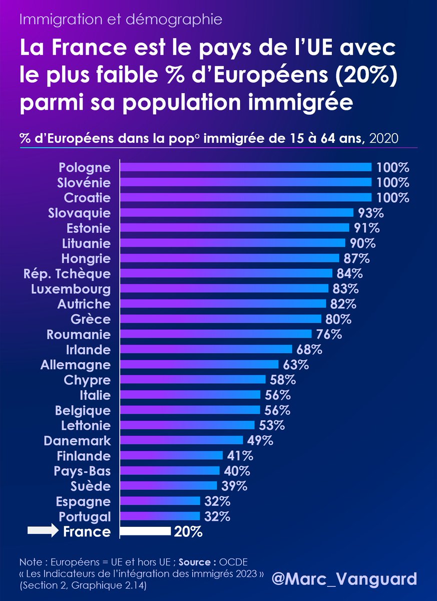 Dit autrement, la France est donc de très loin le pays de l'UE qui accueille le plus d'extra-européens parmi sa population immigrée. 1. 🇫🇷 80% 2. 🇵🇹 68% 3. 🇪🇸 68% 4. 🇸🇪 61% 5. 🇳🇱 60%