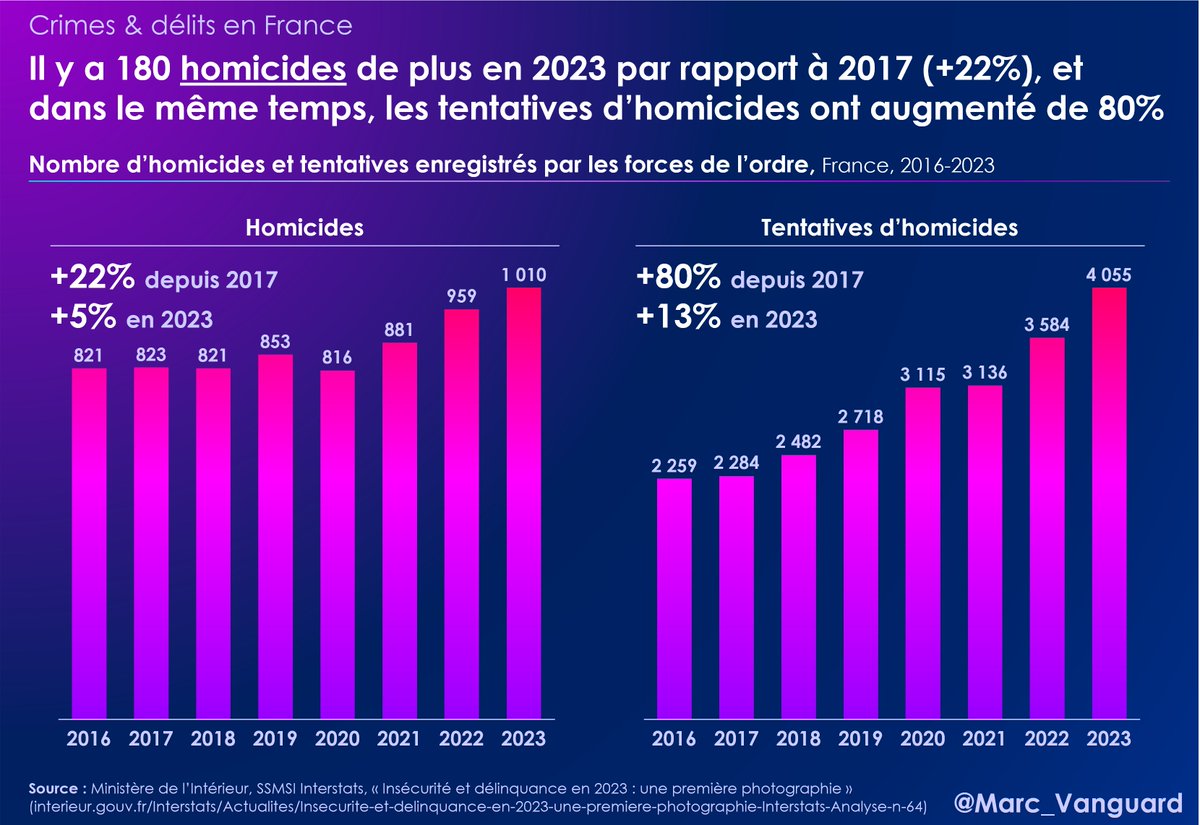📈 La folle explosion des tentatives d'homicides se poursuit en 2023, avec une hausse de +13% par rapport à 2022 et +80% par rapport à 2017.