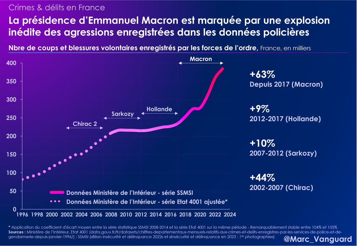 🟣 Le nombre de coups et blessures volontaires enregistrés par les forces de l'ordre n'a jamais été aussi élevé que sous la présidence d'Emmanuel Macron, frôlant une moyenne annuelle à 300 000 victimes déclarées.