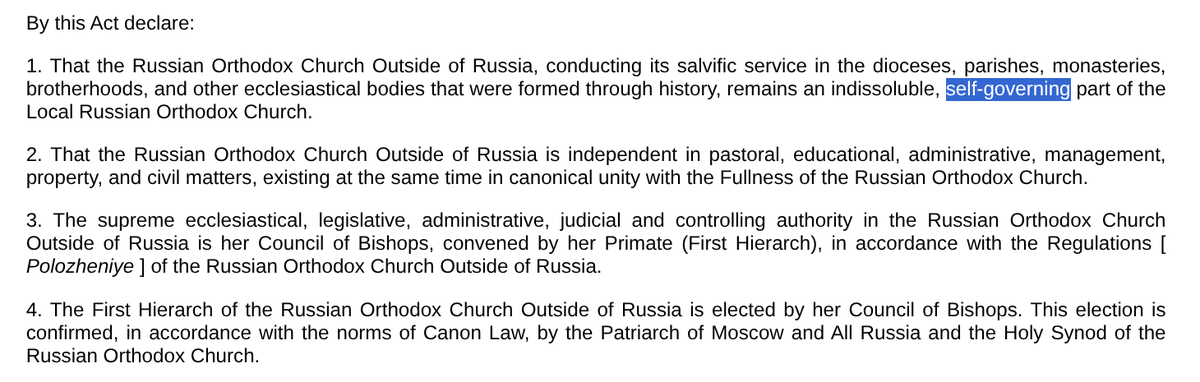 2. However, whilst ROCOR entered into communion with the MP, ROCOR remained SELF-GOVERNING. (I.e. it is not governed by Moscow, and hence is not a part of the MP.) This is made clear in Article 1 of the Act: Image