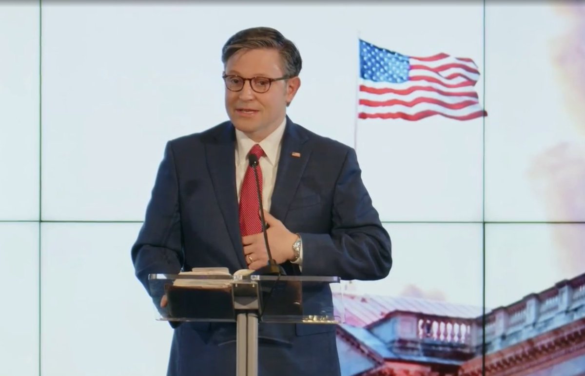 Then Mike Johnson got up to segue to a time with congressional representatives praying. This included legislators like Greg Steube, notable for recently starting to fly the Christian flag outside his office, & Glenn Grothman, who flies the Appeal to Heaven flag by his office. 11/