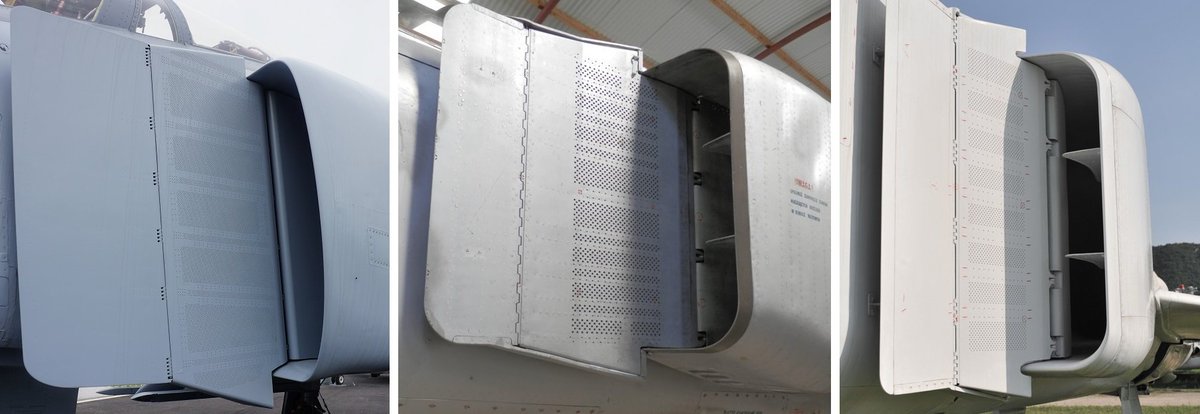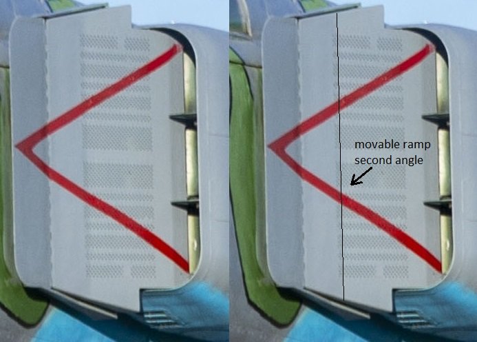 One last difference is the presence of side air-doors , that open up during high engine RPM & low speed modes, to compensate for the intakes being sized for high speeds, due to pressure difference. I don't know if the F-4 Phantom has similar doors. Maybe @heatloss1986 can help.