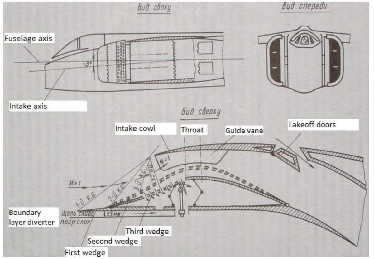 and with boundary layer bleed holes on the movable portion of the ramps. They also have the same mode of venting said boundary layer, through two chutes top and bottom of the ramps. They also have those sharp struts between the splitter-plate and fuselage. I'll add the J-8II...