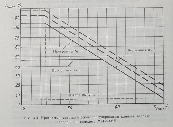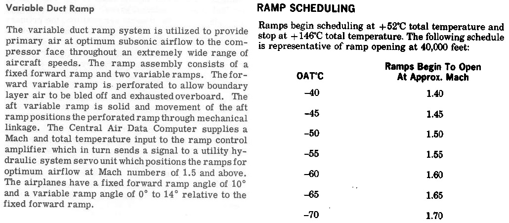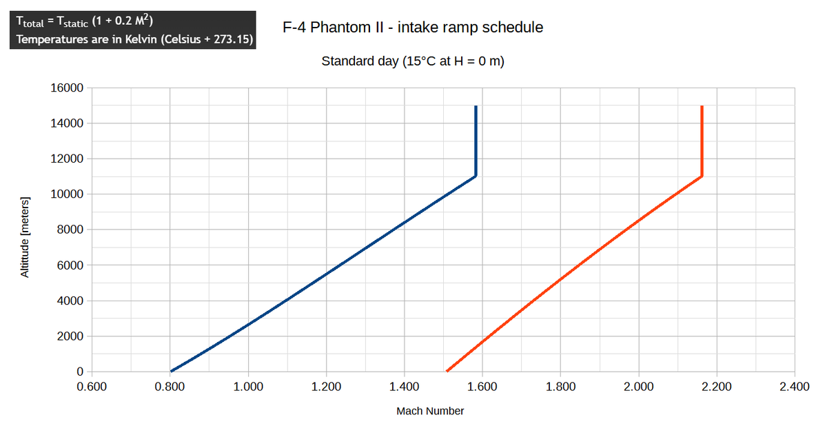 The F-4 ramp schedule is a function of total (stagnation) compressor inlet temperature (CIT). On a standard ICAO day (t = +15°C at H = 0 m), they begin to move at an outside air temperature (OAT) t = +52°C, corresponding to M ≈ 1.5 at H = 11000 m).