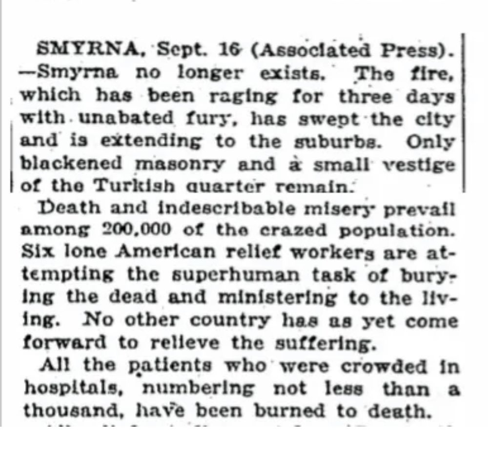 The Great Fire of Smyrna was the peak of the Asia Minor Catastrophe, and the last phase of the Greek genocide, bringing an end to the 3,000-year Greek presence on Anatolia’s Aegean shore and shifting the population ratio between Muslims and non-Muslims.