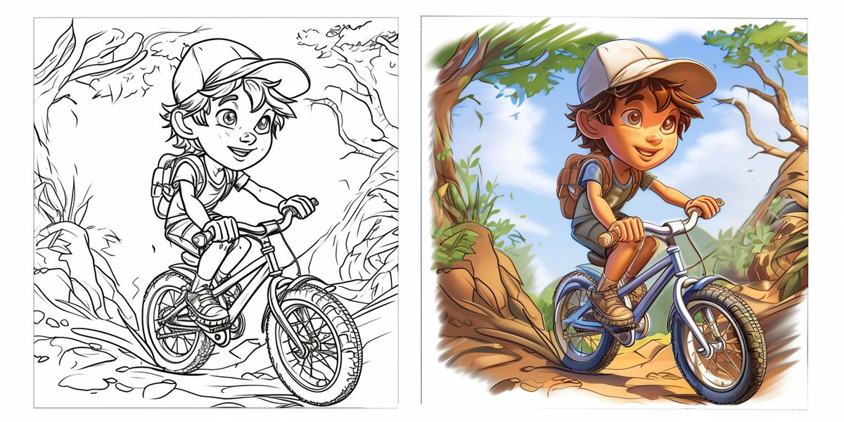 On the left, a black and white simple children's coloring book illustration featuring a [X] with no shading, with a white background. On the right, the same illustration with color. --ar 2:1 --style raw --sref [see image below] --stylize 250 --v 6