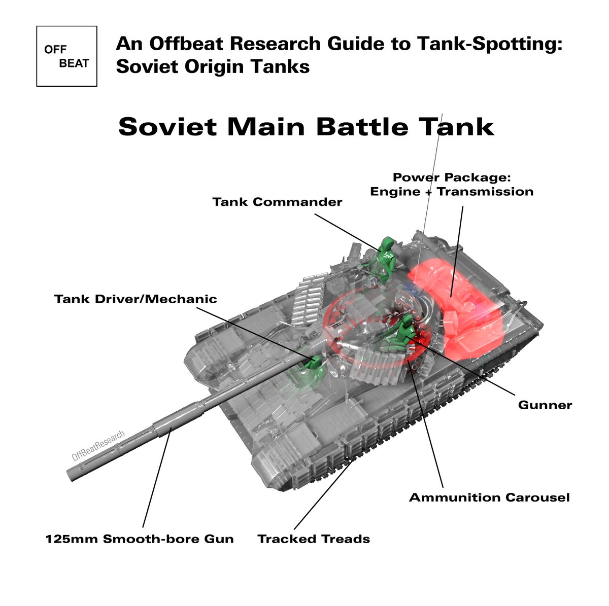 A Soviet-origin main battle tank has several distinctive and consistent features, highlighted here.