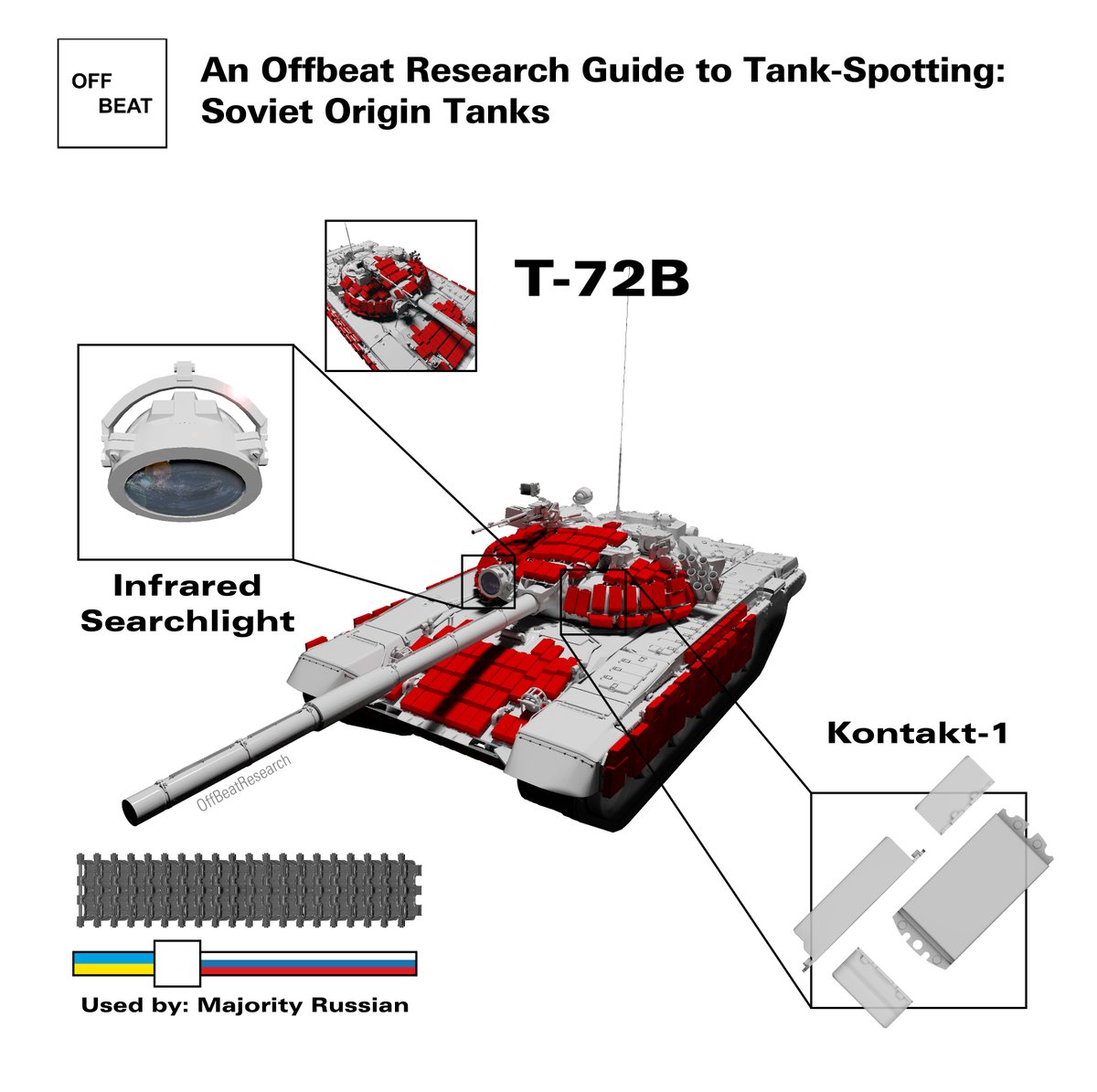The T-72B has an infrared searchlight mounted on the right side of the cannon, and a unique tread pattern which can be distincted from the previous T-64BV variant.
