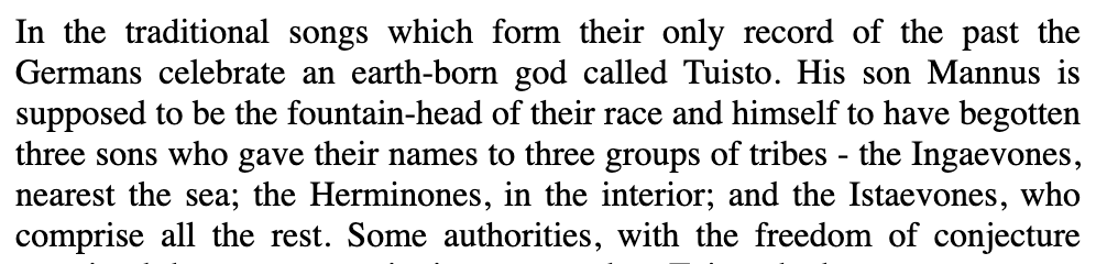 Tuisto named by the Roman Tacitus, is hailed as ancestor of the Germans.